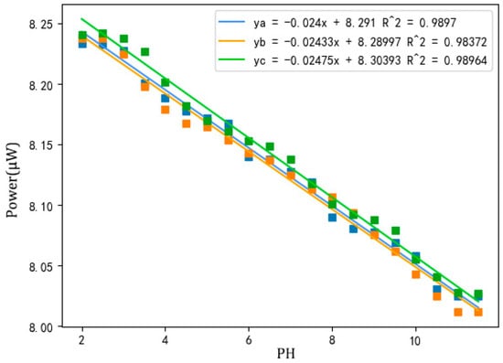 Three pH sensors prepared under optimized conditions were placed in buffer solutions with different pH values, and measured continuously for 30 s after the value on the power meter was stable. The recording was performed every 10 s. The average value of three measurements was taken as the final value, and the pH value was calculated by fitting a curve as shown in Figure 7.