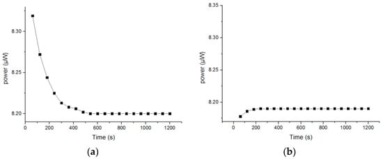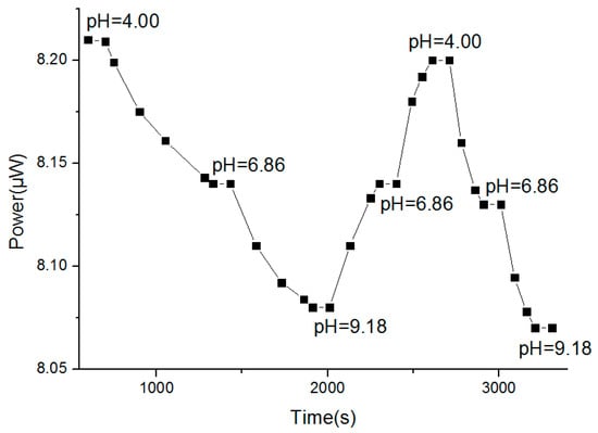 In Figure 8a, it can be seen that the measured value first rapidly decreased and became stable around 600 s. However, in Figure 8b, at the initial stage, the measured value increased, and gradually became stable at about 200 s, where the standard deviation of the power variation within 20 min was 0.00277, and the relative standard deviation was 0.03911%. Therefore, the sol–gel-based optical pH sensor has good stability. The initial change in Figure 8b was probably due to the washing of the sensor with deionized water.