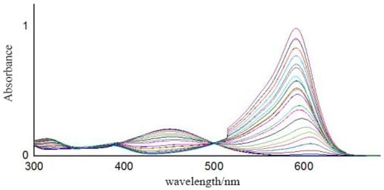 In Figure 10, a higher curve peak around 600 nm suggests a higher solution pH value. It can be seen that the two curves with pH values of 6.5 and 7.0 were close to each other, which corroborates the results in Figure 7 that the absolute error predicted by the SVM model of the near-neutral solution (pH = 6.86) is larger than that of the acidic (pH = 4.00) and alkaline (pH = 9.18) solutions. The acid dissociation constant (pKa) values of the four indicators in the sensitive membrane are listed in Table 6, where the color of the indicator obviously changes between pKa − 1 and pKa + 1 [23]. Therefore, according to Table 6, the theoretical color change range of our prepared sensitive membrane is 2.8~9.0. Actually, when the sensitive membrane was dipped into solutions with 2.5 < pH < 3.0 and 9.0 < pH < 11.0, the absorbance curves also changed, indicating that it can also work with pH values varying from 2.5 to 11.0, which may be due to the interaction of the four indicators.