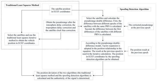 To sum up, the proposed algorithm has three steps: (1) pseudorange differences calculation; (2) iterative solution; (3) comparison with the traditional least squares method. The conclusion can be drawn as: the spoofing detection algorithm’s result approximates the traditional least squares method’s result when the signal is real. Otherwise, the results of these two algorithms are different. Based on this, the authenticity of the signal can be determined. To implement the algorithm, we need to get the pseudorange and the ephemeris from the GNSS receiver. The satellite position is determined based on the information of the ephemeris. Using the information of the pseudorange, the difference calculation and the iterative solution are carried out. Explicit algorithm flows are given in Figure 2 and Figure 3. In Figure 2, the detailed spoofing detection process is presented. In Figure 3, we give the analysis explanation of the pseudorange double-difference model establishment and solution.