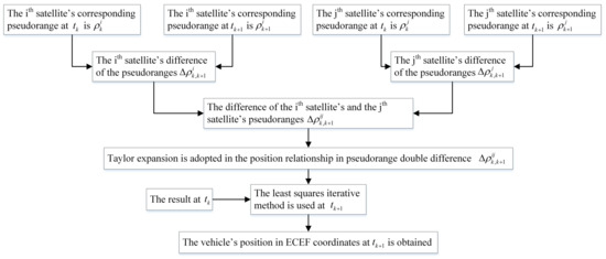 For the traditional least squares method [25], only the measurement information of one time epoch is needed. The pseudorange after corrections at can be written as: