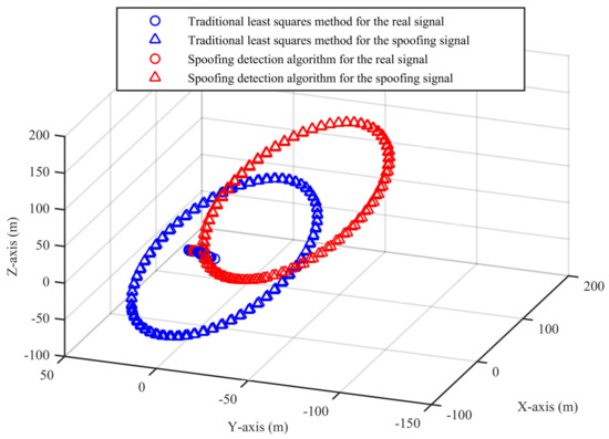 We apply the traditional least squares method and the spoofing detection algorithm to the datasets and use (−2,185,955.407, 5,181,417.961, 2,999,272.014) as a reference point for coordinate transformation in the results shown in Figure 5.