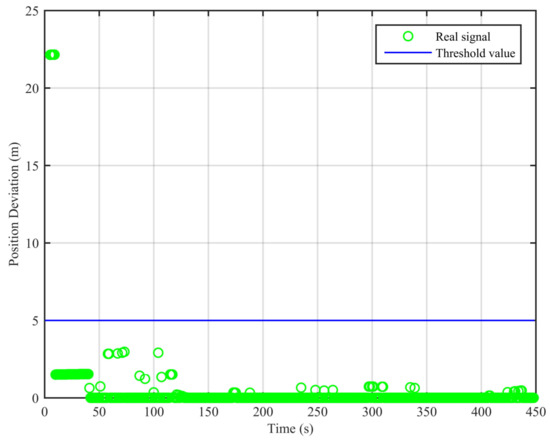 The traditional least squares method’s result at the first epoch is used as the initial value in the calculation. From Figure 11, we can see that the position deviations are larger than the threshold, and this indicates the existence of the spoofing signal. In this scenario, the missed detection rate when the signal is spoofing is 0.82%. This proves that the proposed spoofing detection algorithm is effective for the dynamic whole-time duration position spoofing scenario.