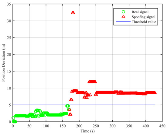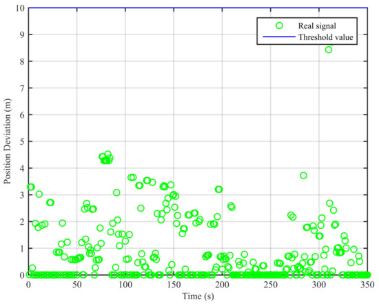 From Figure 4, we can see that the position deviations are smaller than the threshold value when the signal is real. When the signal transponder is turned on, the receiver starts to receive the replayed signal, and the position deviations start to increase and become larger than the threshold value. Based on these differences, we can determine the existence of the spoofing signal. The false alarm rate when the signal is real is 0%, and the missed detection rate when the signal is spoofing is 18%. The missed detections mainly occur within the short period after the signal is switched from real to spoofing. In this period, the position deviations caused by the spoofing signal are smaller than the threshold value.