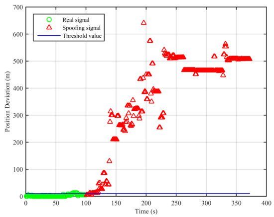 For the spoofing scenarios, the positions obtained by the traditional least squares method and the spoofing detection algorithm are different, and the position deviations will always be larger than the threshold value as long as the spoofing signal exists. The authenticity of the signal can then be determined. The spoofing detection algorithm’s results do not represent the receiver’s real position, thus the position deviations do not represent the position bias caused by the spoofing signal. Therefore, we cannot see the effect of the 600-m offset. If it is only solved by the traditional least squares method, we can observe that the receiver is slowly driven by the spoofing signal and reaches its final offset of 600 m.