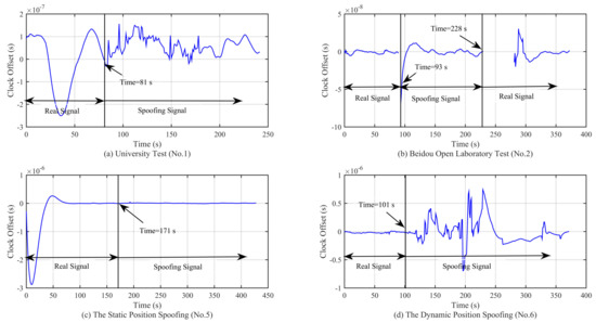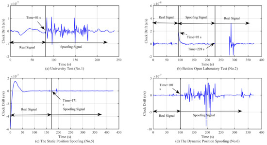 As shown on Figure 12a,c, there is a slow convergence at the beginning; this is due to the code smoothing process within the receiver. From the simulation results, we can see that when the spoofing signal appears, the clock offset presents an oscillating state, and the amplitude of the oscillation is related to the motion state. For example, Figure 12a,d shows the cases where the receiver is in a moving state and the clock offset oscillation range is larger than that of Figure 12b,c. In the Beidou Open Laboratory test, the large oscillation only occurs in the process of signal switching. When the signal is locked in the spoofing signal, the clock offset oscillation is not so obvious, and the spoofing signal has completely taken over the receiver at this time. In addition, it can be seen from the four subfigures in Figure 12 that the clock offset is not the same magnitude, which limits the application of the method based on the jump detection of the clock offset, as the detection threshold needs to be set in advance. This method cannot be applied to the scenario in which the signal is spoofing from the beginning. From the simulation results in Figure 13, we can see that the clock drift shows similar characteristics as the clock offset. The range and magnitude of the oscillation will limit the application of this method. Moreover, as can be seen from Figure 12c and Figure 13c, there is no obvious change in the clock offset and the clock drift, which poses a challenge for the signal detection based on the method in [1].