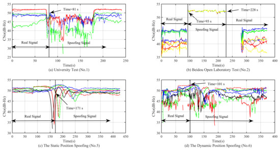Simplistic spoofing attacks and meaconing can be regarded as “simple spoofing”. This “simple spoofing” is defined as a non-overlapped spoofing scenario. The main characteristic of this kind of spoofing is that the correlation peak of the spoofing pseudo-random noises (PRNs) is not overlapped with that of the authentic ones. This attack is usually generated by a hardware simulator or replayed by a signal transponder. An effective way to spoof a receiver in a non-overlapped scenario is to first jam and make the receiver lose its lock on the real signal and instead capture the spoofing signal [9]. In this scenario, the spoofing signal appears as a noise and only affects the effective carrier noise power ratio (C/No). For example, in the simulation scenario of the “Beidou Open Laboratory test” in Section 3, the signal is switched from the real to the spoofing signal with an absolute power advantage. Another effective way to spoof a receiver in a non-overlapped scenario is that the receiver enters an area that the satellite signal cannot cover, then the signal is generated through the simulator or replayed through the transponder to achieve spoofing. In this case, even if the value of C/No is lower than that of the real signal, the spoofing signal can still be captured by the receiver. In this scenario, the value of C/No is mainly affected by the transmitting power. The simulation scenario of the “university test” in Section 3 is an example of this case.