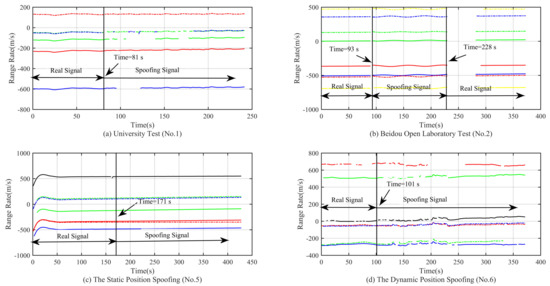 From the simulation result in Figure 14a,b, we can see that the C/No has a relatively significant change when the spoofing signal is acquired. At this time, we can use the method of C/No jump detection. For the static and dynamic position spoofing scenario, the spoofing signal is switched by a 0.4-dB and a 0.8-dB power advantage, respectively. Therefore, we cannot observe any obvious changes. The method of C/No jump detection is invalid for these two kinds of spoofing scenarios. From the simulation result in Figure 15, we can see that none of the changes of range rates for these four kinds of spoofing scenarios is obvious. Therefore, the method of range rate jump detection is invalid.