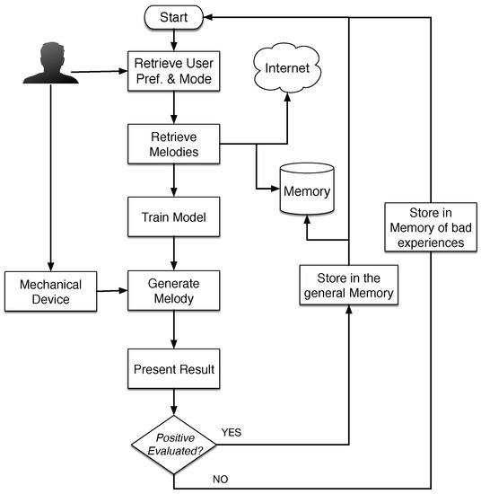 In this section, we detail the overall structure of the developed system. One of the goals is to promote collaboration between humans and machines, in order to generate melodies according to users’ preferences, or context in which the system is used. Therefore, the system is equipped with a mechanical device that communicates human indications to the machine. The device consists of a mechanical arm that the user can guide to partially control the melody. Additionally, the machine learns from the users’ behavior in order to improve its final results. The system can work in different modes which will be explained in the next sections. Independently of the mode, the system follows the flowchart shown in Figure 1 that is implemented by the MAS architecture.