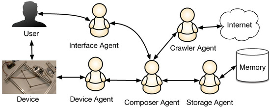 Interaction between computers and humans also plays an important role in the generation of music and this can be easily modeled with a MAS [24]. For example, ref. [25] described the Musebot and the Musebot ensemble to explore collaborative methodologies for the creation of collective compositions based on a combination of agents and communities. In this case, the agent is an entity that interacts with the user transparently, making the communication process easier for the users. Ref. [26] proposed a multi-agent system which generated melody pitch sequences. The agents have melodic intelligence and generate pitches as a result of artificial emotional influence and communication between agents, and the melody’s hierarchical structure is a result of the emerging social agent structure. Again, the agents interact with the users, and the results show the users are satisfied with this process, partly due to this encapsulation. This kind of behavior would be harder to model without the involvement of agents.