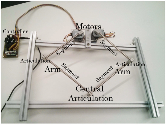 Before going into details on the algorithm for the generation and control of melodies, we should first explain that the device used (Figure 3), has been partially developed by Professor Wataru Hashimoto from the ILO (Osaka Institute of Technology) [30]. The device consists of 2 interconnected motors anchored to an aluminum frame, to create a pantograph with 2 degrees of freedom. We also have two articulated arms with two segments (L and l) each, which are connected by a central articulation.
