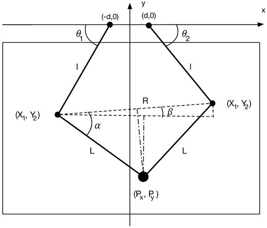 The Device Agent makes all the pertinent calculations each time the position of the central articulation changes. In particular, the agent makes use of the values given by the mechanical device so that each pair of input angles , of the motors could be translated into a particular position in the plane, as shown in Figure 4. Therefore, a system of trigonometric equations is applied, following the set of triangles generated by the distance d from the center of the motors to the segments L, l and the angles and . In particular, P is calculated as: