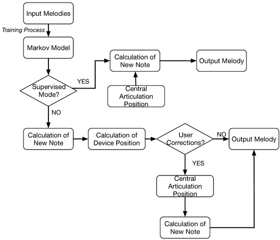 The Composer Agent aims to generate a melody by applying not only the statistical model but also the interaction of the user with the mechanical device. Therefore, a hybrid approach is proposed and designed according to Figure 6.