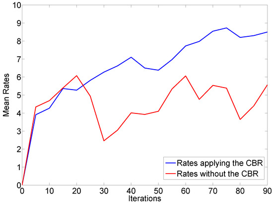The blue line represents the overall ratings when the CBR agent is integrated in the system. As we can see, the graph shows a general increase when the number of iterations raises, which demonstrates that the system learns from user preferences to improve the results. On the other hand, the red line plots the overall ratings when the CBR agent is not present in the system.