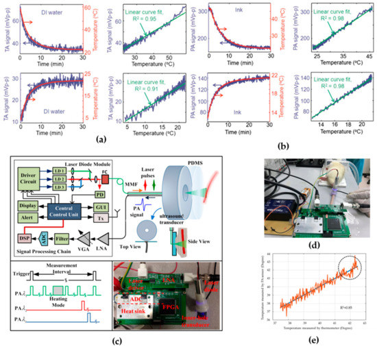 - Liu, S.; Feng, X.; Ruochong, Z.; Zheng, Y. Portable photoacoustic system for noninvasive blood temperature measurement. In Proceedings of the 2018 IEEE International Symposium on Circuits and Systems (ISCAS), Florence, Italy, 27–30 May 2018. [Google Scholar]