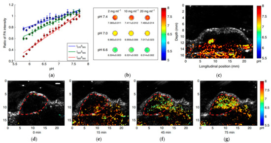 - Jo, J.; Lee, C.H.; Kopelman, R.; Wang, X. In vivo quantitative imaging of tumor pH by nanosonophore assisted multispectral photoacoustic imaging. Nat. Commun. 2017, 8, 471. [Google Scholar] [CrossRef] [PubMed]