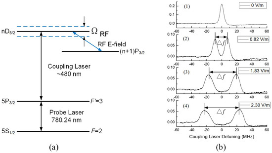 Atoms producing the EIT can be used as an active sensor for optically detecting the RF E-field. A specific E-field in the RF range can couple some high-lying Rydberg states, such as nD5/2 and (n + 1)P3/2 in Figure 1a, which results in quantum coherence in the probe transmission. From a phenomenon point of view, EIT spectroscopy is split by a RF E-field coupled Rabi frequency ΩRF defined in Equation (1). This is known as Autler-Townes (AT) splitting [7].