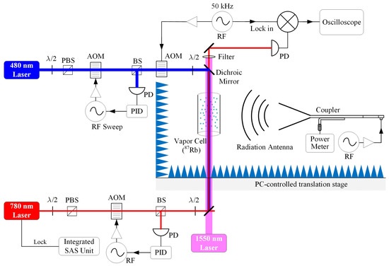The measurement setup is shown in Figure 3. In a room-temperature atomic vapor cell, rubidium (87Rb) atoms were excited by the counter-propagating probe and coupling lasers via a two-photon transition in a ladder-type configuration. The probe laser was generated from an external-cavity diode laser (ECDL) (Toptica DL Pro), and was frequency-locked to |5S1/2, F = 2>→|5P3/2, F′ = 3> transition via an integrated saturated absorption spectroscopy (SAS) unit of 87Rb atoms, resulting in a linewidth of ~100 kHz. The coupling laser was produced by a high-power doubled-frequency diode laser system (Toptica TA-SHG), and its frequency was scanned across the resonant frequency of Rydberg transition |5P3/2, F′ = 3>→|nD5/2> using an acousto-optic modulator (AOM). The power of the two lasers was stabilized using two proportional-integral-derivative (PID) controllers, separately, and a power deviation of less than 1% was achieved. In the following experiments, the power of the probe laser and the coupling laser was stabilized to 10 μW and 35 mW, respectively. The probe and coupling lasers overlapped counter-propagating, and their beams were focused to a waist-diameter of 100 μm and 150 μm, respectively. The transmission spectroscopy of the probe laser was detected by a high-speed photodiode detector (PD) and recorded by a digital oscilloscope. To improve the signal-to-noise ratio, the coupling laser was amplitude-modulated by a 50 kHz sine wave using another AOM, and the resulting probe transmission signal was demodulated by a lock-in amplifier. In addition, with a thermal coating using a high temperature paint (Pyromark) and 1550 nm high power laser illumination, the surface temperature of the vapor cell can be heated up to about 60 °C [28].