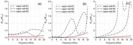 The field distribution results coincide with the eigenmode analysis normally up to the lowest resonant frequency, where the field distortion was relatively small. To minimize the cavity resonance effect, the incident wave frequency should be much lower than the resonant frequencies of the modes that can be excited. Their lower modes have different resonant frequencies. Vapor cells 1 and 2 had different outer sizes but the same wall thickness (1 mm). It is clear that a larger size resulted in lower resonant frequencies, meaning that it would be easier to disturb the field. This is consistent with the conclusion by Fan et al. [21]. Vapor cells 2 and 3 had the same inner size (8 mm) but different wall thicknesses. The lowest mode of vapor cell 2 was resonant at 18.01 GHz, whereas the lowest mode of vapor cell 3 was resonant at over 24.72 GHz. The reduction in wall thickness increased the lowest resonant frequency by 37.3% for the studied case, thus reducing the field disturbance.