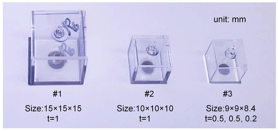 The vapor cells in Table 2 were fabricated using a Pyrex glass bonding technique. Figure 5 shows a photo of this. Sometimes it is difficult to fabricate a vapor cell with very thin walls, and so only two parallel walls perpendicular to the field propagation of vapor cell 3 were made as thin as 0.2 mm, whereas the others were 0.5 mm in thickness. The 87Rb vapor pressure was about 10−5 Pa.