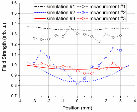 The field strength distribution in the center of different vapor cells along the x-axis was measured using the setup illustrated in Figure 3. The applied 15.09 GHz E-field couples the Rydberg states 52D5/2 and 53P3/2. The results are given in Figure 6, together with the HFSS-based simulation results. It is obvious that the field strength distortion was reduced not only by reducing the size of the vapor cell, but also by reducing the wall thickness. The measurement results were consistent with the simulation prediction.