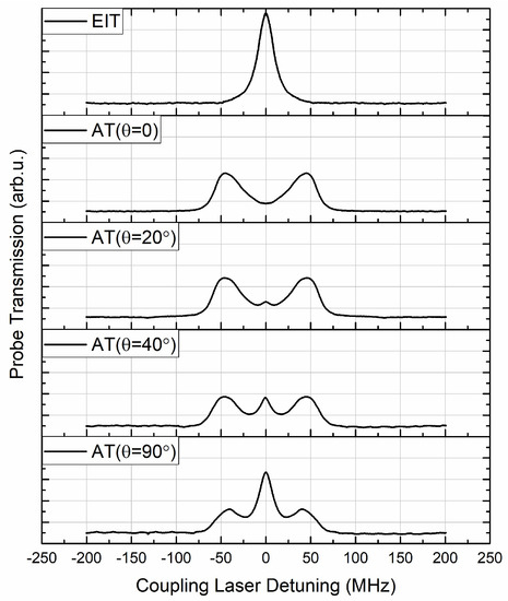 In the phenomenon of RF E-field-induced AT splitting within an EIT, the probe transmission spectroscopy is dependent on the laser and RF E-field polarization. Sedlacek interpreted this by considering all 52-level degenerate magnetic sublevels of each state, taking 5S1/2 → 5P3/2 → 53D5/2 → 54P3/2 as an example [9]. Typical EIT and AT splitting spectroscopy with and without the presence of RF E-fields are illustrated in Figure 7, where the first curve (noted as “EIT”) is the EIT spectroscopy of the probe laser without any incident RF E-field, and the other curves are the AT splitting in the presence of a 15.09 GHz E-field. The lineshape differences are due to variation in the relative angle (θ) between the E-field vector and laser polarization. In an ensemble of atoms, some will exhibit three-level behavior, and others will have four-level behavior, so experimental lineshape can be characterized as combinations of three-level EIT and four-level EIT-AT. The probe transmission at zero coupling detuning (Δc = 0) increased as the relative polarization angle (θ) increased from 0° to 90°, and reached a maximum when θ was 90° (cross-polarized).