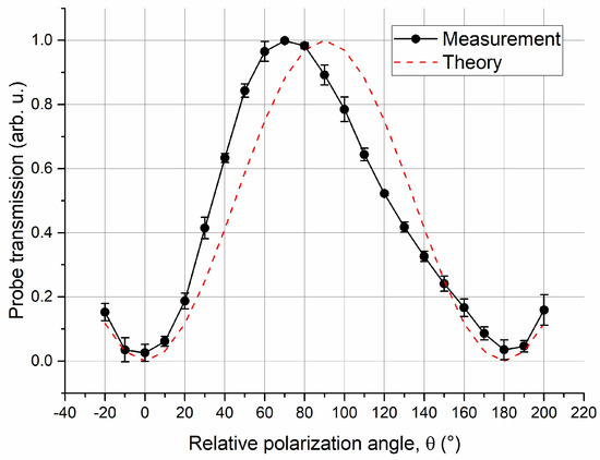 An approximated equation of the probe transmission at zero coupling detuning (Δc = 0), as a function of the relative angle of E-field vector and co-polarized laser polarization, is given in [9], which is represented here as Equation (3):
