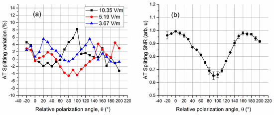 Influence of relative angles between laser polarization and RF E-field vector on the E-field strength measurement: (a) the variation in AT splitting determination relative to the splitting when laser polarization and RF E-field vector are well matched, and (b) normalized signal-to-noise ratio of the AT splitting.