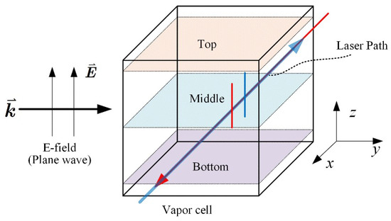 The simulation model for investigating the polarization distortion inside a cuboidal vapor cell, where the propagation () and polarization ( ) of the RF E-field and lasers are illustrated with a systematic coordinate. The calculation focused on the three typical layers located at the top, middle, and bottom of the vapor cell.