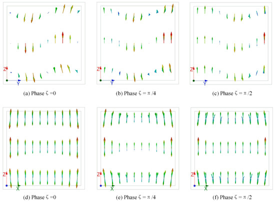 Simulation results of RF E-field vector distribution inside a 20 mm cuboidal vapor cell at 15 GHz. Vector distribution projecting on the yz-plane while observing along the x-axis, with relative phases of incident E-field of (a) 0, (b) π/4, and (c) π/2, respectively. Vector distribution projecting on the xz-plane while observing along the y-axis, with relative phases of (d) 0, (e) π/4, and (f) π/2.
