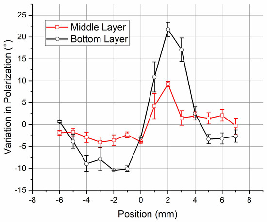 There was little variation in the internal E-field polarization in laser propagation of the middle layer, as shown in the simulation results in Figure 11. The angle ψ nearly remained constant at 90°, and thus Equation (3) can be simplified as Equation (4). For the cases where ψ varies from 90°, as the vector distribution in the top and bottom layers, θ determined by Equation (4) will be underestimated.