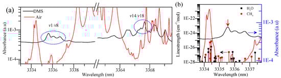 The absorption peak wavelength and strength of DMS candidate regions are listed as well as the spectral information of possible interferences from air absorptions. In Figure 1a,b and Table 1, there are about three main absorption peaks at the ν1/ν8-band between 3333.7 and 3337.8 nm, and the ν1/ν8-band of 3336.710 nm suffers much lower interference than ν14/ν18-band of 3367.229 nm, including the magnitude of interference and distance between the absorption line and the interference line. Thus, we chose 3333.7–3337.8 nm as our ultimate selection for DMS measurement with comprehensive consideration. Furthermore, although CH4 and H2O have less interference in the absorption of DMS, they are located at the working range of the laser. At the same time, the absorption spectra of methane and water overlap each other, thus it is necessary to obtain the concentration of three gases simultaneously by using the MCSF.