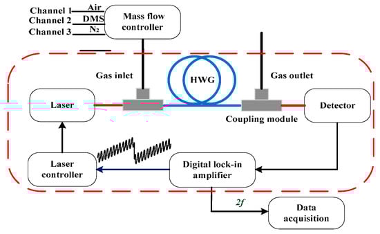 We developed a DMS gas sensor based on our instrument development platform [,,,], which consists of a homemade digital lock-in amplifier with signal generation function, a laser controller, a DFB-ICL, a hollow waveguide (HWG), and a photodetector. The schematic plot of the sensor is shown in Figure 2. The digital lock-in amplifier sent out a high frequency modulation signal to the laser controller (ILX Lightwave, Irvine, CA, USA, LDC-3908); the DFB-ICL (Nanoplus GmbH, Gerburnn, Germany) with wavelength of 3337 nm was used as the optical source; and both the temperature and current of the laser were controlled by the laser controller. The beam emitted from the laser was aligned into the HWG (Polymicro Technologies, Brookfield, IL, USA, Type HWEA10001600), and then collected by the photodetector (Thorlabs, Newton, NJ, USA, PDA20H-EC). The converted electrical signal was sent to the homemade digital lock-in amplifier and demodulated. Through data acquisition software, the 2f signal was processed by MCSF program to obtain the target gas concentration.