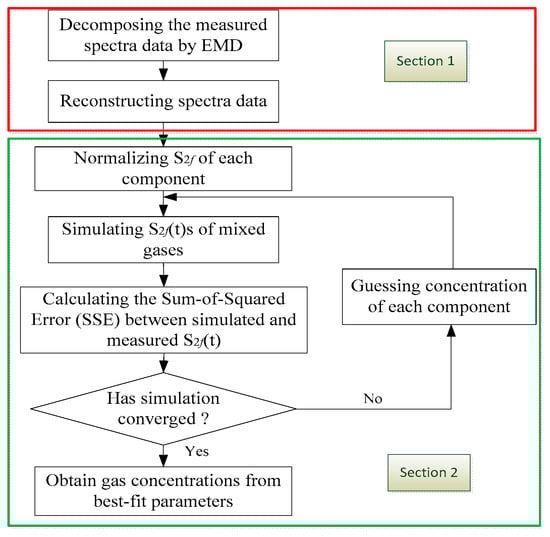 As for the wide-band characteristics of the MIR fingerprint absorption, the measurement sensitivity and accuracy are always deteriorated by overlap with adjacent spectrum, optical fringes, and noise. A solution by EMD and reconstruction to the recorded spectral data was developed in our previous work [], as shown Section 1 in Figure 3. EMD decomposes the signal into a series of Intrinsic Mode Function (IMF) components; these components have different physical meanings. Thus, we can eliminate optical fringes and noise according to the characteristics of signal, and reconstruct the original signal. In view of the above, we combined the MCSF and EMD to calculate and optimize the multi-component concentration in a mixture. Steps of this algorithm are displayed in Figure 3.