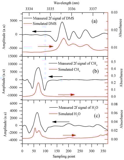 (a) The simulated absorbance and reference WMS-2f signals of DMS (20.2 ppm × 5 m); (b) the simulated absorbance and reference WMS-2f signals of CH4 (3 ppm × 5 m); and (c) the simulated absorbance and reference WMS-2f signals of H2O, simulation data come from HITRAN database, 1 atm, 296 K.