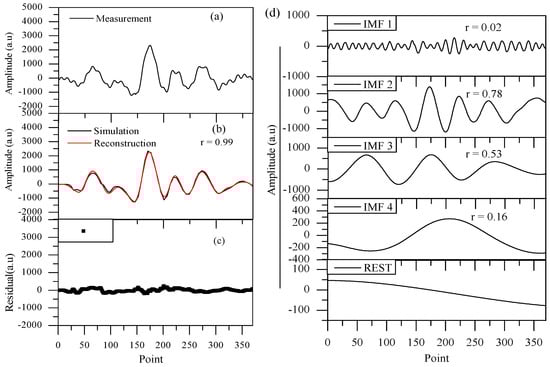 We reduced the interference from noise and optical fringes by decomposing the measured 2f signals of the mixture and reconstructing them with the EMD method. Take the mixture of H2O (0.14%)-CH4 (0.19 ppm)-DMS (10.1 ppm) as an example: about four IMF components were obtained. Thus, according to the signal characteristics of correlation coefficient, amplitude, and symmetry, the signal was reconstructed, as shown in Figure 5a–d.