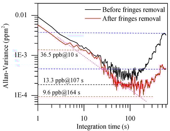 Comparison of Allan variance of the sensor before and after fringes removal.