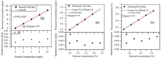 (a) The concentration of CH4 and H2O remained at 0.95 ppm and 0.7%, respectively, while the concentration of DMS ranged from 2.02 ppm to 10.1 ppm (in 2.02 ppm intervals) in the first group, and the standard deviations between nominal concentration and measured concentration are presented; and (b,c) the volume of DMS remained at 10.1 ppm, the concentration of CH4 ranged from 0.19 ppm to 0.95 ppm (in 0.19 ppm intervals) while the concentration of H2O ranged from 0.14% to 0.7 % (in 0.14% intervals) in the second group, and the standard deviations between nominal concentration and measured concentration are presented.