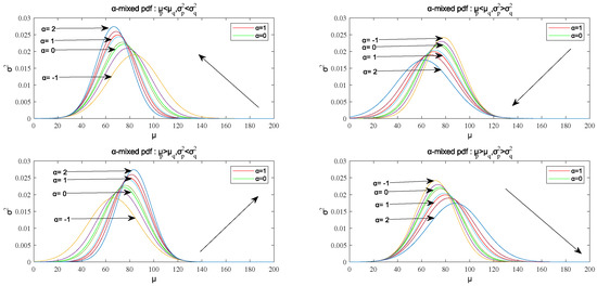 When , the -mixed probability density function is the interpolation function of and , so its mean value and the variance are all between and , as shown in Figure 2, and its image curve is also between them.