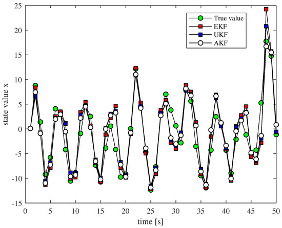 According to Theorem 1, when , the non-linear filtering method we proposed is feasible theoretically. In the simulation experiment, the algorithm is validated by taking different values when . We name our proposed method as AKF and compare it with the traditional non-linear filtering methods such as EKF and UKF.