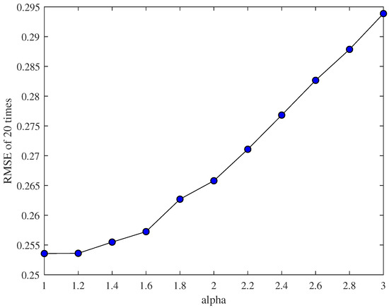 In the end, we analyze the performance of the whole non-linear filtering algorithm by adjusting the value of through 20 experiments. In order to reduce the influence of the initial value on the experimental results, we take Q = 0.1 and then average the 20 experimental errors. The result is shown in Figure 5. We can see that the error grows as grows in this example, as the noise is relatively small.