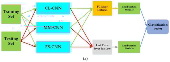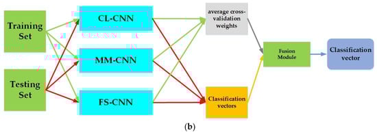 Figure 3 resumes the last two above-mentioned steps of the proposed method. The combination module in Figure 3a could be either the concatenation method or the addition. In Figure 3b, the fusion module is one of the three aforementioned fusion methods in Section 3.3. The average cross-validation weights are needed only in the case where the fusion module is the Accuracy Weighted Sum.