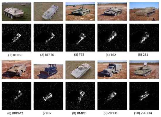 The MSTAR benchmark data set is generally used to compare and test the performance of SAR-ATR algorithms. It was collected by the Sandia National Laboratory SAR platform [49]. Hundreds of thousands SAR images enclosing ground targets were collected, containing different target types, aspect angles, depression angles, serial number, and articulation. However, only a limited subset is publicly accessible on the website [50]. The publicly data set available consists of ten different classes of ground targets: (air defense unit: ZSU-234; armored personnel carrier: BMP-2, BRDM-2, BTR-60, and BTR-70; tank: T-62, T-72; rocket launcher: 2S1; truck: ZIL-131; bulldozer: D7). They were collected using an X-band SAR sensor, in a one feet resolution spotlight mode, with full aspect coverage. Each image has a size of around 128 by 128. The images are already centered with 0 °C to 360 °C degrees of orientation. Figure 4 depicts examples of SAR images of ten types of targets at similar aspect angles and their corresponding optical images. The data set is composed of 5172 image decomposed into 2747 training images and 2425 testing images. The distribution of training and testing data for the different targets is illustrated in Table 2.