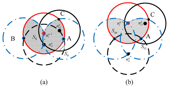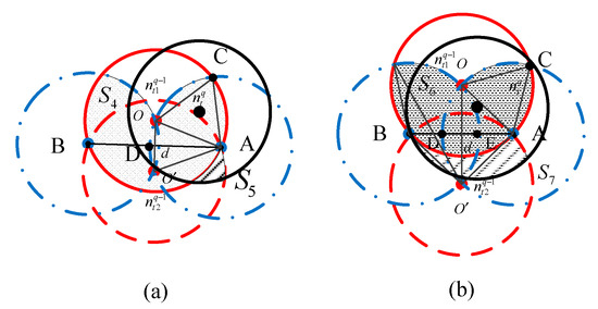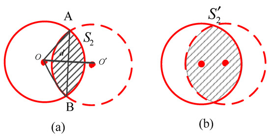 As shown in Figure 7a, the area equals twice the area of region ACD minus the half intersection area of circle A and B, i.e., , plus the half intersection area of circle and , i.e., . The area of region ACD equals to the area of sector ACD plus the area of sector OAC minus the area of triangle OCA; thus,