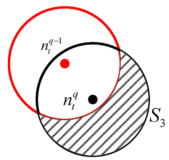 As illustrated in Figure 8, the two black circles denote the communication range of two transmitting nodes, and , in the forwarding. The red circle denotes the communication range of transmission node in the forwarding. The calculation of and is similar to that of and :