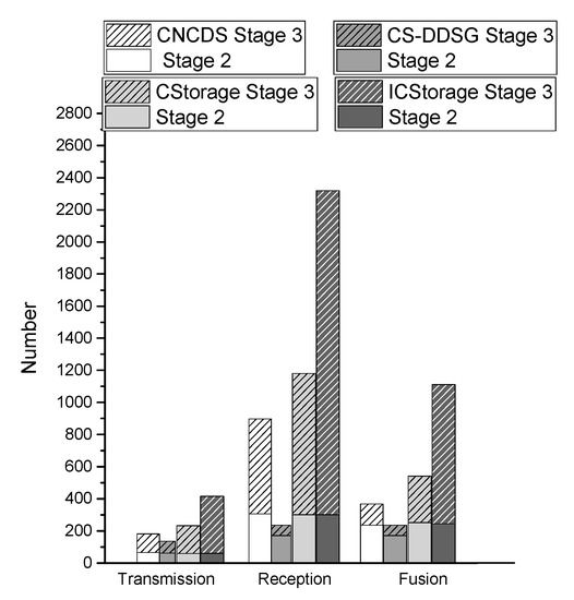 Figure 12 presents the number of fusions and receiving nodes during each forwarding round when . The forwarding process of CS-DDSG repeats five times, until no node remains to accept the broadcast packets, while CNCDS, CStorage and ICStorage repeat six, nine and twelve times, respectively. The network employing CS-DDSG has the fastest convergence and characteristics of efficiency due to the strictest reception conditions. Moreover, most of the data fusion occurs during Stage 2, and subsequently the number of fusions rapidly decreases in Stage 3 except in ICStorage.