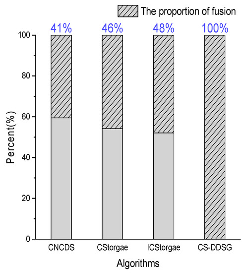 Furthermore, we investigate the fusion proportion of the total number of receptions. As presented in Figure 11, only 41% of the receiving nodes in CNCDS merge the received packets; the authors consider that only 41% of nodes lose energy. In fact, 59% of the receiving nodes also consume energy because they would receive the broadcast packet first and then determine whether the condition of CNCDS are satisfied; the received packets will be merged only if they satisfy the condition. Thus, energy is consumed even when the received packets are not fused. However, the number of receptions in [21] is the same as the number of fusions, which is less counted. Similarly, 46% and 48% of the receiving reception nodes in CStorage and ICStorage merge the packets, respectively. In CS-DDSG, all received nodes are fused and no redundancy occurs because the nodes receive packets only once. Thus, the energy consumption of CS-DDSG receiving nodes is much smaller than that of the other algorithms. In conclusion, CS-DDSG effectively reduces both the number of transmissions and receptions.