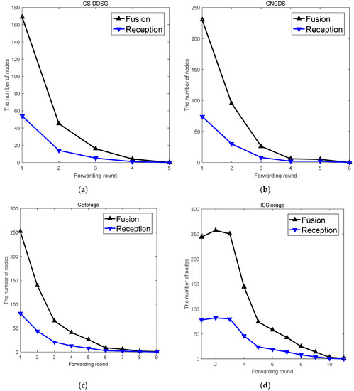 The number of fusions and receiving nodes during the forwarding process: (a) CS-DDSG; (b) CNCDS; (c) CStorage; and (d) ICStorage.