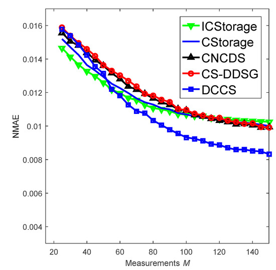 In Figure 13, we investigate the recovery performance of the algorithms when and the number of measurements , which is queried by the mobile sink, ranges from 15 to 150. It can be observed that, with an increase in , the recovery accuracy of ICStorage, CStorage, CNCDS and CS-DDSG are improved and equivalent, while the performance of CS-DDSG becomes slightly better when . This improvement occurs because the more information that is gathered, the better is the reconstruction accuracy. According to Equation (12), the sink constructs measurement matrix based on the packets fused by the forwarding nodes. The forwarding nodes of CS-DDSG receive only one packet, and the is sparser than that in the others algorithms. Consequently, less information is gathered and fewer nodes contribute to data recovery for CS-DDSG. However, with an increase in , more information is gathered and the gaps separating the four algorithms decrease. When , CS-DDSG outperforms the four DDS-based algorithms due to the strong spatial correlation of the measurement vector. Moreover, the reconstruction accuracy of DCCS is the best when is large enough and there is no packet loss. All nodes in DCCS participate in gathering data and DCCS adopts dense measurement matrix in clusters. Thus, more information is gathered. In addition, performance tends to be stable as increases.