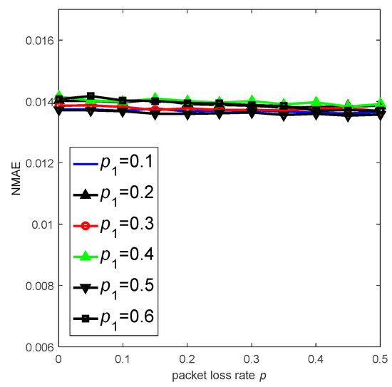 Figure 14 shows the performance of CS-DDSG under different packet loss ratios and probabilities when . As increases, the value of NMAE remains stable, i.e., . This result indicates that CS-DDSG effectively resists the packet loss and maintains high reconstruction accuracy even when unreliable links exist. Additionally, its accuracy is not influenced by due to the very sparse measurement matrix.